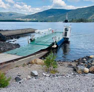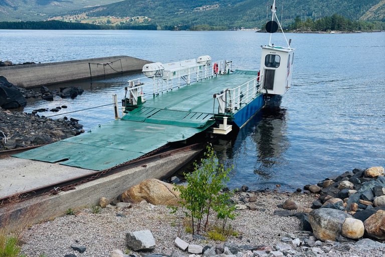 Ein weiteres Highlight ist die Fahrt mit der Fjoneferja, Norwegens kleinster Autofähre, die das Ost- und Westufer des Sees verbindet.